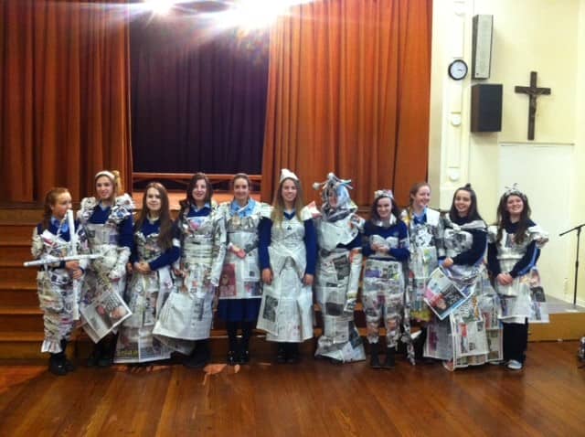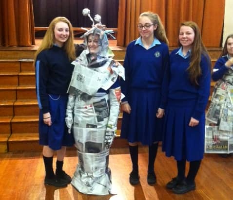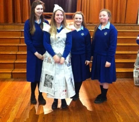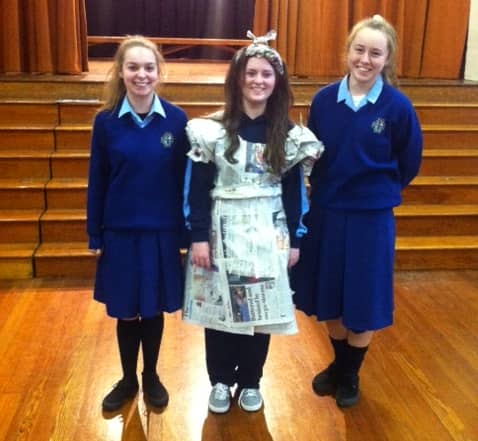 Emer Lorenz of Fourth Year represented Maryfield on Friday the 6th of March in the Junk Kouture Leinster final at the Helix. From 952 entries only 320 were chosen to perform at this regional final. Emer did us proud performing a beautiful dance to the song Puttinâ on the Ritz. She was ably assisted from 11am until 11pm by Doris Boldijar of Third Year and Julie Dory of Second Year. Doris and Julie helped with make-up, hair and last minute adjustments to Emerâs gorgeous tea dress which was made out of teabags. Well done to all three girls!