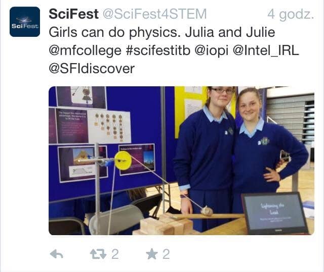 On 6th May 2015, second year students Julie Dory and Julia Grzelak attended Scifest in the Institute of Technology in Blanchardstown with their project âLightening the Loadâ, accompanied by the schools Maths and Physics teacher Mrs McCoy.
